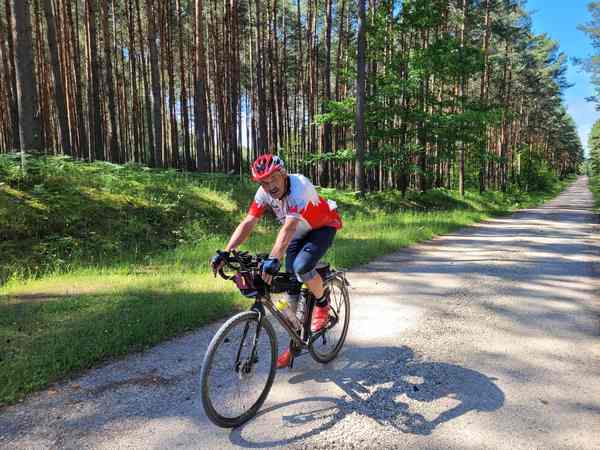 Bezchmurne niebo. Pomimo wczesnej pory słońce zaczyna mocno przypiekać. Męczę się walcząc z pojawiającymi się na drodze piachami. Próbuję omijać "grząskie" miejsca jadąc skrajem pól czy łąk. Jadąc "na świeżo" wszelkie przeszkody udaje się pokonać nie zsiadając z roweru. W nocy czy na dalszych odcinkach trasy skończyłoby się na pchaniu roweru. Inni męczą się jeszcze bardziej, więc mijam kolejnych zawodników.