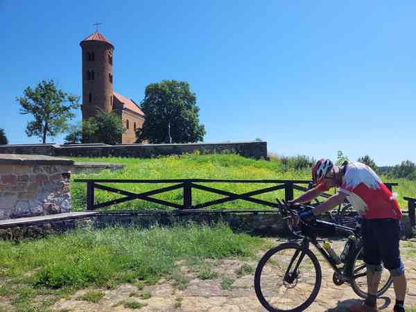 Przede mną kolejne atrakcje, romańska kolegiata w Tumie oraz znajdujące się nieopodal średniowieczne grodzisko. Budowlę ukończono i oddano do użytku wiosną tego roku. Znana ceglana bryła zamku w Łęczycy nie robi większego wrażenia. Jadąc wzdłuż pokopalnianych łęczyckich stawów, mijam odpoczywających pod wiatą zawodników (i zawodniczkę).