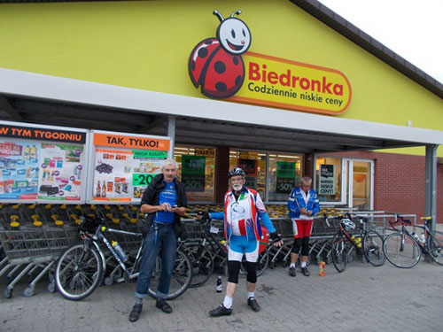 Gęstniejące chmury i pierwsze krople deszczu skłaniają nas do zatrzymania się przed kolejną Biedronką. Po chwili już leje, zostaliśmy tu uziemieni na nieco dłużej niż planowaliśmy. Razem z nami koczują weterani Wacek i Heniek, najstarsi uczestnicy maratonu. Wacek jest starszy ode mnie o 8 lat. Czy ja w tym wieku będę w stanie pokonać tak wymagającą trasę?