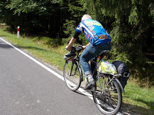 Zbliżamy się do Złotego Stoku. Droga wykręca lekko na prawo i zaczyna się koszmar. Chociaż wkładam w jazdę wszystkie siły, prędkość jazdy spada początkowo do 15, później nawet do 12-13 km/godz. Czuję się tak, jakby jakiś grubas na rozklekotanym składaku trzymał mnie za siodełko. Powietrzna bańka niemal uniemożliwia jazdę. To miejsce jest chyba szczególne, bo jadący niemal 24 godziny wcześniej Jacek Nowicki w swojej relacji ma dokładnie takie same odczucia "jechać się prawie nie da". Marzy mi się moment gdy skończą się płaskie, otwarte przestrzenie a rozpoczną osłonięte lasem podjazdy. Relacja Jacka .