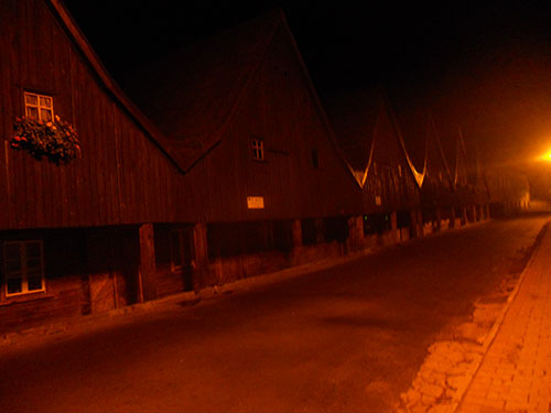 Towarzysząca mi od początku dnia euforia powoli ulatnia się. Narasta zmęczenie, a na monotonnych zjazdach (każdy dłuższy zjazd taki jest) pojawia się senność. Będą z nią walczył niemal przez całą noc. Chwilę po północy zatrzymujemy się w reklamowanym przez Mareckiego od dłuższego czasu Chełmsku Śląskim. Podświetlone nocą zabytkowe chaty tkaczy wyglądają imponująco. Minuty poświęcone na sesję zdjęciową nie są chwilą straconą.