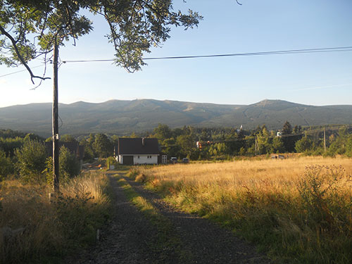 Na kolejnych, odległych o kilkaset metrów fragmentach drogi spodziewam się wypłaszczenia. Upragniony moment przesuwa się coraz dalej i dalej. Nie spodziewałem się tutaj tak długiego i stromego podjazdu. Jazdę umila rozległy widok na Karkonosze z najwyższym ich szczytem czyli Śnieżką.
