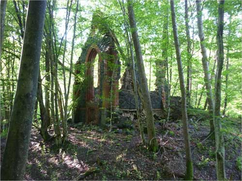 Jedziemy kilkaset metrów dalej w kierunku wyraźnego wzniesienia. Dużo śladów (to punkt wspólny dla trasy rowerowej i pieszej), dobrze widoczne ruiny, skupiska dużych kamieni, fundamenty budowli, są nawet dobrze zachowane kamienne kręgi. Przeszukujemy pagórek na wszelkie możliwe sposoby. Próbujemy precyzyjnie namierzyć się od ostatnich zabudowań wioski. Szukamy w innym kierunku. W ten sposób nigdy ruin nie znajdziemy. Pytamy o ruiny napotkane kobiety. Dowiadujemy się, że: jedyne ruiny kościoła znajdowały się obok wioski i zostały już zaorane a widoczne w lesie ruiny są ruinami pałacu - innych ruin na pewno nie ma.