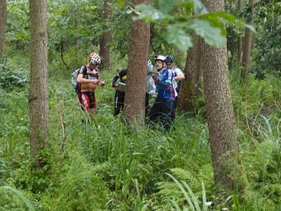 Gdzieś na leśnej drodze przebiega przed nami stado jeleni. Później powtarzają ten manewr w przeciwnym kierunku. Gdy w innym miejscu samotne zwierzę przebiegnie mi drogę na szybkim leśnym zjeździe z przerażeniem nacisnę na hamulce spodziewając się kolejnych osobników. Opuszczamy las. To co najbardziej lubię czyli fragment idealnie równego asfaltu. Punkt znajduje się tuż obok tej drogi. Pozostawiamy rowery w rowie. Przed nami strome, upierdliwe podejście, które na tym etapie imprezy mocno daje się we znaki. PK27 (40) - Szczyt skarpy, dołek na górze - 6:16 (51).