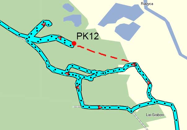 Po tej rozgrzewce. Samotnie ruszam na dalszą trasę. Z czterech ujawnionych na mapie punktów wybieram PK12. Na tym punkcie dowiem się jakie punkty znajdują się na górze mapy. Ciemne chmury odsuwają się na północ pozostawiając zmoczony asfalt. Precyzyjnie odmierzam odległości. Asfalt, most, droga przez łąki. Skręcam (zbyt wcześnie) w las. Kierunek nie za bardzo się zgadza, po widocznej na mapie drodze nie ma najmniejszego śladu. Przedzieram się przez bujną roślinność porastających las. Wreszcie docieram do leśnej drogi. Która to droga? Gdzie ja jestem? Chwilę kręcę się po okolicy, by zrezygnowany wrócić do punktu wyjścia (skraj łąki). Porażka mocno podkopuje wiarę we własne siły.