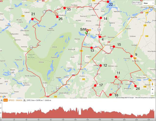 Kiedy zamierzam jechać dalej zauważam, że zniknęła kartka z opisami punktów. Zapasowego opisu nie mogę zdobyć ani od obsługi punktu ani od nadjeżdżającego właśnie Wigora (budowniczego trasy rowerowej). Dowiaduję się tylko o położeniu najbliższego punktu. Kilka minut przed 1 w nocy opuszczam to nieprzyjazne miejsce.