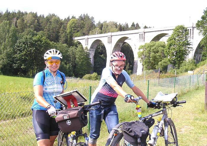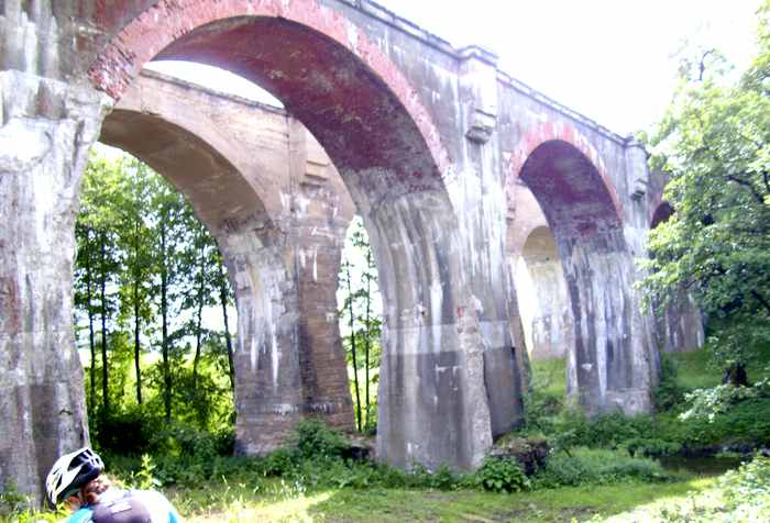 Na mapie odsłaniają się kolejne punkty. Przed dojazdem do znnego ze zdjęć wiaduktu jedziemy ten znajdujący się nieco na uboczu. Męczące szutrowe podjazdy i sprawiające dużo przyjemności ostre zjazdy. Mostek na płynącej dolinką rzeczki. Nie zauważam wszechobecnego wokół dróg, ukrytego w trawie grodzącego pastwiska drutu. Noga wytrzymuje, drut nie, pozostawiając jednak na piszczeli czerwony ślad. Może mam trochę szczęścia, ten drut nie był pod napięciem. PK33 (most 10m na N) - 14:07 (44,0).