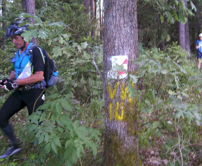 Kontynuujemy jazdę na południe. W dalszym ciągu idzie mi to całkiem nieżle. Bez dłuższego zastanowienie na rozwidleniu dróg wybieram tę po lewej stronie. Szybki zjazd i hamowanie na skraju pojawiających się łąk. Punkt musi znajdować się nieco powyżej. Chociaż znajduje się nie więcej niż metr od skraju, liście doskonale maskują jego położenie i chwilę musimy poświęcić na jego poszukiwania. PK38 (drzewko na górce na skraju lasu) - 21:14 (119).