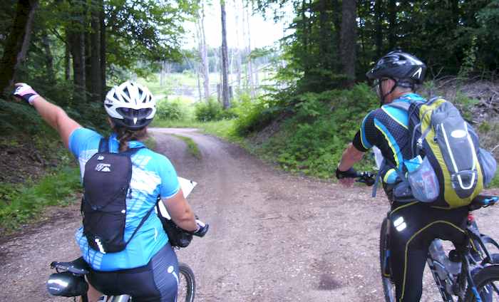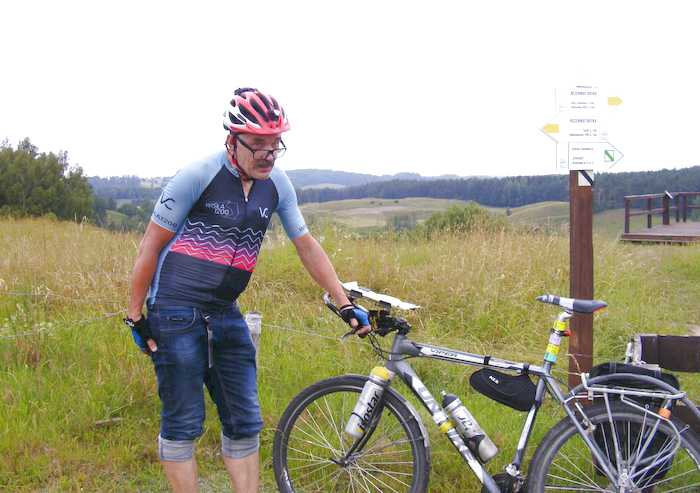 Ponieważ odsłoniętych na mapie jest tylko 5 punktów czas potrzebny na podjęcie decyzji jest krótki. Możemy jechać na południe i zaliczać punkt T55 (literka T oznacza punkty z kodami) lub skierować się w przeciwnym kierunku i tu najlepszym z 4 widocznych punktów będzie najbliższy czyli T50 na Górze Zamkowej. Ruszamy trasą, którą poznałem podczas wczorajszej przejażdżki. Na stromym podjeździe jadę obok Jarka. Był podjazd, więc jest i ostry szutrowy zjazd. Koncentruję się na nierównej szutrowej, krętej drodze. Kiedy wreszcie oglądam się widzę pustkę. Nikt za mną nie jedzie, nie ma też zawodników których widziałem przed sobą. Chociaż planowałem jechać w grupie, już na początku zostaję sam. Jak w tej sytuacji sobie poradzę?