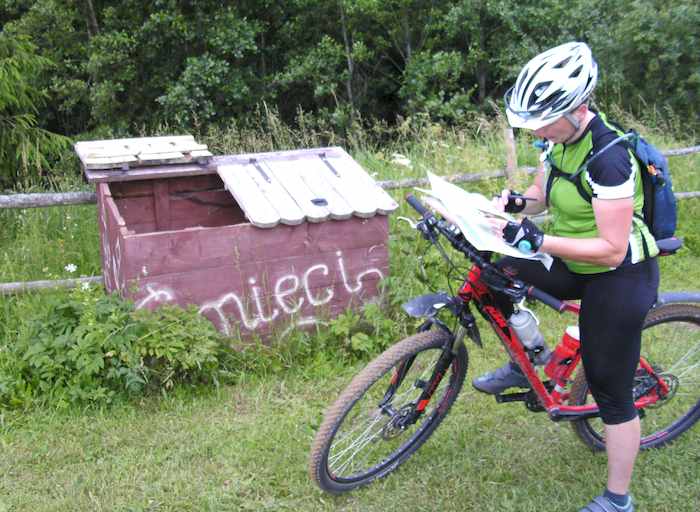 Na drodze naprzeciw ukrytego wśród drzew wysokiego obelisku zatrzymała się grupa znajomych bikerów. Jedna z cyfr z odległości kilkunastu metrów jest trudna do zidentyfikowania. Na szczęście można to zrobić metodą prób i błędów. Po wpisaniu błędnego kodu można to zrobić jeszcze raz - aż do skutku. Wpisując błędny kod można też przypadkiem "zaliczyć" zupełnie inny punkt kontrolny. Zliczony przypadkowo punkt zostanie przez organizatora anulowany. Położenie poznanych przy okazji takiej pomyłki punktów zostaje przerysowane na mapę. Najpierw taką pomyłkę popełnia Ewa w innym miejscu Magda. T39 (obelisk - rok) - 13:43 (38,6).