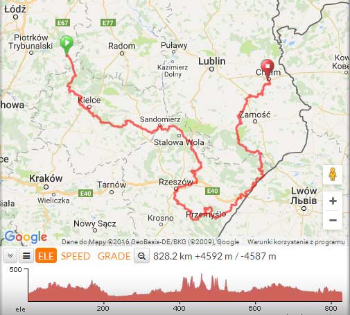 dystans ok. 162 km - godz. 16:42 czas przejazdu 11:13 (czas jazdy 9:03), przewyższeń 640 śr. 17,9 km/godz.