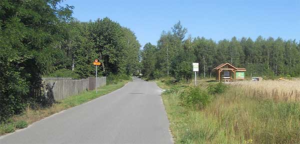 Po godzinie jazdy docieram do Końskich i miejsca w którym rozpoczyna się lub (jak kto woli) kończy szlak GV. Po chwili opuszczam miasto. Z zainteresowaniem obserwuję fragment trasy, którą przebiegać będzie Maraton Północ-Południe. Brak zakazu jazdy rowerem na jezdni, a obok przyzwoitej jakości ścieżka rowerowa z niefrezowanej kostki. Pomimo pewnego dyskomfortu przy pokonywaniu wyjazdów z posesji rozpędzam się powyżej 30 km/godz. Za Sielpią wzdłuż lasu poprowadzona jest nowa asfaltowa ścieżka rowerowa równością nie ustępująca asfaltowej drodze wzdłuż której prowadzi.