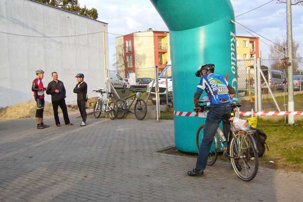 Oddycham z ulgą. Spodziewam się, że najdłuższy i najcięższy podjazd mam już za sobą. Mam nadzieję, że to najwyższy punkt na dzisiejszej trasie. Próbuję dołączyć się do opuszczających punkt zawodników. Zjeżdżamy dróżką po przeciwnej stronie wzniesienia. Jest tak stromo, że na ścieżce pojawiają się schody. Obok nich wymyta nieco przez wodę nierówna "rynna". Nie chcąc ryzykować upadku prowadzę rower. Zawodnicy, z którymi opuszczałem punkt są już daleko z przodu. Kiedy kilometr dalej zatrzymuję się usiłując odnaleźć swoje miejsce na mapie z tyłu nadciągają Mirek z Mikołajem, bez zastanowienia ruszam za nimi. Utrzymanie się na kole, lub co najmniej w zasięgu wzroku wyrywających do przodu mistrzów wydaje się zadaniem na granicy moich możliwości. Na szybkich szutrach trzymam się dość dobrze, kiedy zaczynają się podjazdy lub droga "psuje się", prowadząca dwójka niebezpiecznie oddala się. Sytuacja byłaby beznadziejna gdyby nie to, że na kolejnych skrzyżowaniach zatrzymują się by skontrolować mapę, a ja odrabiam stracony dystans. Punkt zaliczamy razem. PK10 - Barłomino - wyrobisko żwiru (godz. 7:19, 27 min. od poprzedniego punktu). Na kolejnym punkcie PK20 będę już od nich o 20 minut później.