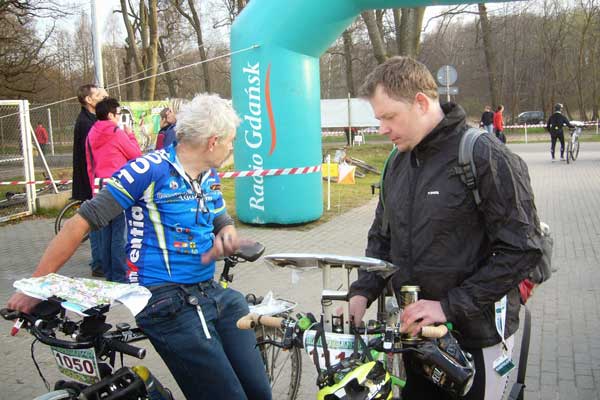 Teraz dla odmiany czeka mnie całkowicie pozbawiony asfaltu odcinek trasy. Jadę przez Tawęcino i dalej pionowo do góry mapy. Na początku pozytywnie zaskakuje wyjątkowo równa i twarda gruntowa, polna droga. Gdy ta nieco psuje się, wjeżdżam na równie twarde i równe koleiny prowadzące polem porośnietym niewielkim o tej porze roku, ledwie odrastającym ponad ziemie zbożem. Dalej jest już gorzej. Jazdę utrudniają rozlewające się na całej szerokości drogi bajora. Mijam Borkowo i równie kiepskimi, mokrymi leśnymi drogami kieruję się w kierunku punktu. Gdzie jest poszukiwany "skraj lasu" kiedy z każdej strony otaczają mnie drzewa? Szósty zmysł, dobra orientacja a może przypadek sprawia, że (w momencie, kiedy zaczynam wątpić) kilkadziesiąt metrów w głębi lasu pojawia się znany widok: namiot, dwóch rowerzystów i lampion punktu kontrolnego. PK09 - Bargędzino - skraj lasu (10:51 - 45).