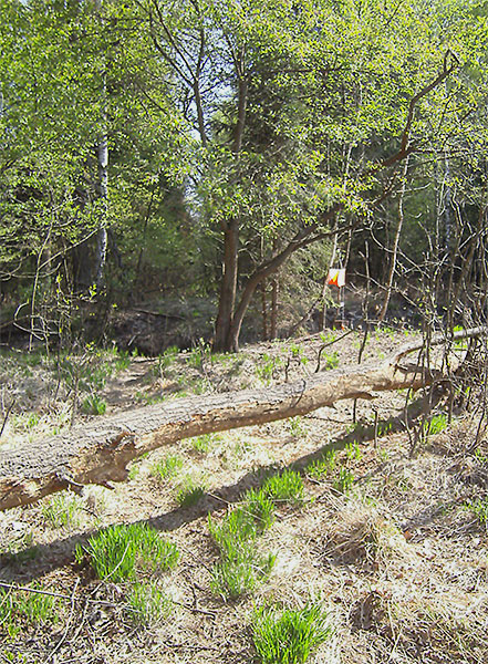 Czas na meandrującą rzeczkę, którą w przeddzień startu pokazywał na mapie jeden z miejscowych uczestników rajdu. Obstawiałem, że gdzieś tu musi być punkt. Punkt jest i to nawet niezbyt daleko. Tylko jak najsprawniej do niego dotrzeć. Rzeka płynie skośnie do każdej z istniejących tu dróg czy przecinek (ślad dojazdu do punktu będzie miał kształt zębów piły). Wybieram wariant północny. Dość sprawnie docieram rowerem do końca przecinki. Ostatnie kilkaset metrów dzielących mnie od rzeczki dużo lepiej będzie pokonać bez zbędnego balastu. W którym miejscu pofałdowanej rzeczki znajduje się lampion. Po przeciwnej stronie punktu szuka Jarek z Krzyśkiem. Czeka mnie niemiła niespodzianka, punkt oczywiście jest ale po przeciwnej stronie głębokiego rowu (z mapy nie było to tak oczywiste). Mam szczęście, w wielu miejscach leżą powalone drzewa. Po jednym z nich przeprawiam się na drugi brzeg, po innym wracam na stronę na której pozostawiłem rower. 8E - meander rzeczki.