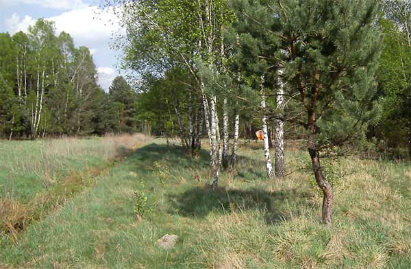 Na trasie przejazdu znajduje się teraz mało wartościowy (30 pkt) punkt, którego - ponieważ znajduje się "po drodze" - nie warto pominąć. Starannie sprawdzam odległości, obserwuję zakręty szutrowej drogi na której się znalazłem. To musi być tu. Wdrapuję się prawie na grzbiet wzniesienia. To byłoby zbyt proste - tu punktu nie ma. Jakieś wybrzuszenia terenu znajdują się w połowie podejścia. Mimo wszystko na zaliczenie tego punktu nie tracę zbyt wiele czasu. 3J - róg wałów ziemnych.
