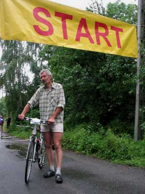 Kąpiel, gorący posiłek. Deszcz leje bez przerwy. Kiedy wychodzę na miejsce, w którym znajduje się meta ze zdziwieniem widzę wjeżdżającego na metę Wigora. W jaki sposób, skąd dostał rower? Zdziwienie jest jeszcze większe, gdy dowiaduję się, ze przyjechał na własnym rowerze. Przecież sam widziałem jak trzymał dwie nie dające się połączyć jego części w swoich rękach. Sprawa okazuje się dziecinnie prosta, tak prosta, że aż nieprawdopodobna (ja bym na to nie wpadł). Warto chyba napisać co trzeba zrobić (co zrobił Daniel) gdy na trasie złamie się widelec. Czego zresztą nikomu nie życzę. Kiedy złamiemy widelec: Dochodzimy do zabudowań najbliższej wioski. Jeżeli pierwsze drzwi są zamknięte, pukamy do następnych. Pytamy gospodarza czy posiada spawarkę. Nie, nie posiada ale ... kuzyn. Prosi by poczekać, wsiada w trabanta i jedzie. Po kilkudziesięciu minutach jest z powrotem trzymając w ręce "nowy" widelec. Teraz wystarczy złożyć wszystkie pozbierane z szosy łożyska i jechać dalej. Oczywiście gospodarz nie chce nawet słyszeć o jakiejkolwiek zapłacie za przysługę.