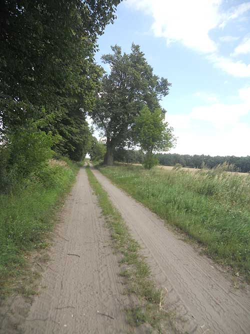 Przejeżdżam przez ociekające wodą ulice Mogilna. Zawracam w kierunku gminy Trzemeszno. Ślad prowadzi drogą pomiędzy polami. Pomimo, że przez ostatnie godziny nieźle popadało, trafiam na nie dające się pokonać piaski. Jadąc/prowadząc rower mijam najwyższy punktu (ok. 155 m) na mojej trasie. To nie jest droga, którą chciałbym dalej jechać. Wycofuję się z kolejnego odcinka piaszczystej drogi do mijanego chwilę wcześniej asfaltu. Decyduję się na improwizację i objazd ciężkiego odcinka. To co z mapą byłoby prościzną, z GPS-em staje się loterią. Każda z asfaltowych dróg może w każdej chwili skręcić w niepożądanym dla mnie kierunku. Tym razem udaje mi się. Mijam przejazd kolejowy i widzę tablicę z nazwą gminy.