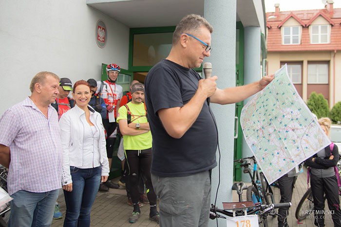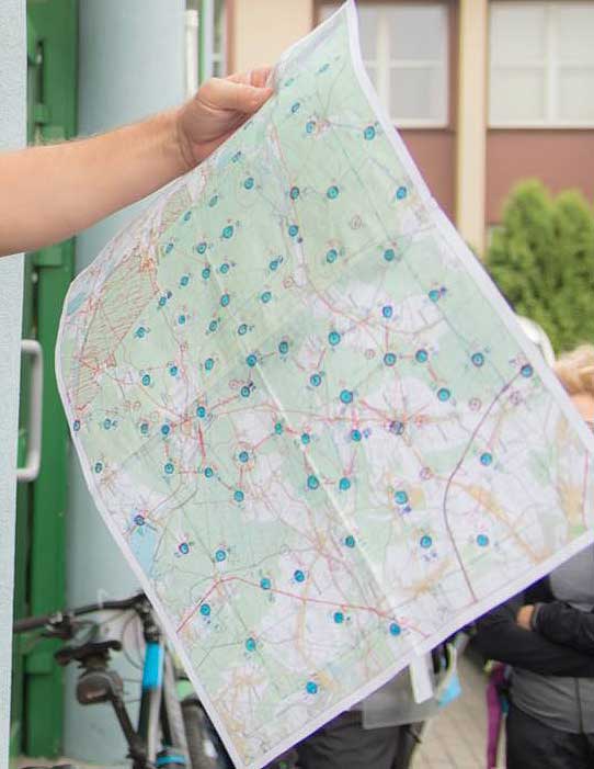 Prezentacja radosnej twórczości budowniczego trasy w przeddzień zawodów. Widok gęsto upstrzonej punktami mapy wzbudza uśmiech na twarzach tych, którzy jutro wyruszą na trasę. Wreszcie nadchodzi ten czas. Każdy z uczestników ma już w dłoniach zapakowane w foliową koszulkę (przecież pada) dwie przytulone plecami mapy formatu A3 w skali 1:50tys. Przy tak dużej ilości punktów nie zamierzam przedłużać analizy mapy. Poza wyborem pierwszego punktu stawiam na pełną improwizację. W momencie kiedy pada komenda start (godz. 8:10) ruszam na trasę. Opuszczam miasto asfaltową drogą prowadzącą na północ.