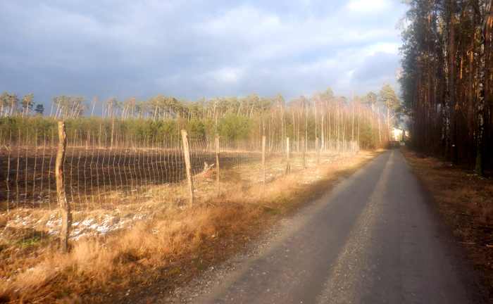 Dotychczas nie wspominałem, że prognozy obok opadów zapowiadały wyjątkowo silny wiatr. Tej niedogodności udało się nam uniknąć przemieszczając się niemal przez cały czas przez rozległe obszary leśne. Z powrotem przedostajemy się na przeciwległy brzeg Baryczy. Wbiegamy (o ile po 6 godzinach jazdy można to tak nazwać) na niewielkie wzniesienie. Na szczycie obok betonowych bloków znajdujemy drzewo z lampionem. To już rutyna: zdjęcie lampionu i wysyłanie SMS-a podczas zbiegania w dół. PK53 - fundamenty wieży (13:55).
