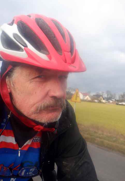 Zjazd nierówną, błotnistą drogą na brzeg rzeki. Zaliczam łatwy aczkolwiek bardzo wartościowy punkt, dodając do osiągniętego wyniku kolejne 70 punktów. PK71 - koniec drogi (15:21). Zjazd był jedynie dość trudny technicznie (Mariusz zalicza glebę). Dopiero powrót na asfaltową drogę jest prawdziwym wyzwaniem. Błoto, niespecjalnie stromy ale długi podjazd i niesprzyjający jeździe wiatr. Ból, brak sił. Czuję jakby przy każdym obrocie moje nogi wyginały się.