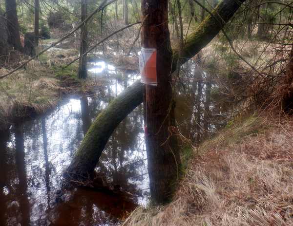 Co zrobić z kolejnym niezbyt nieoczywistym punktem (PK53) znajdującym się kilka kilometrów na południu. Żaden sposób jego zaliczenia nie wydaje się być optymalny. To dobrze, że mapa dzisiaj wielokrotnie pozytywnie nas zaskakuje. W miejscu zwykłych wydawałoby się dróg pojawiają się nowe szutrówki ( i jest ich wyjątkowo dużo), na miejscu zaznaczonych przerywanymi kreskami przecinkami całkowicie przejezdne leśne drogi. Czasami rozczarowują dawniej jak wynika z mapy dobre drogi. Pozostawione same sobie zamieniły się w piaskownicę. Bez narzekania, nawet tu można gravelem przejechać. Marcowe piachy diametralnie się różnią od tych jakie będą tu w miesiącach letnich. PK53 - Krzywe drzewo w wodzie (11:22).