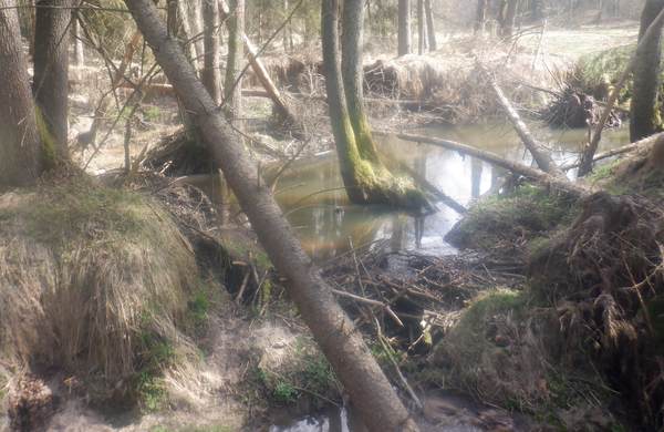 Mijamy zabudowania Krupskiego Młyna. Objeżdżamy punkty położone na drugiej części części mapy, czyli położone najbardziej na zachód od bazy. Przy życiu utrzymuje mnie świadomość, że kiedy skręcimy na wschód wiatr powinien być naszym sprzymierzeńcem. Odnalezienie drzewa w zakolu rzeki nie jest szczególnie czasochłonnym zajęciem. PK65 - Zakole rzeki (13:04). Kaskada na tejże rzeczce też wydaje się trywialnym zadaniem. Zjeżdżamy do lasu na charakterystycznym zakręcie drogi. Leśna dróżka doprowadza nas w dolinę rzeki. Zostawiamy rowery tuż obok kilku innych i ruszamy na poszukiwania. Spotykamy eksploratorów rzecznego nurtu, którzy przybyli tu wcześniej. Jeszcze raz przeszukujemy znaczny odcinek rzeki. Są zanurzone w wodzie pnie z przelewającą się górą wodą. Lampionu brak. Skoro nie poradzili sobie z zadaniem najlepsi 3 orientaliści. Pozostaje wykonanie zdjęcia i telefon do organizatora. Teraz można jechać dalej. PK71 - "Drzewna kaskada" (13:13).