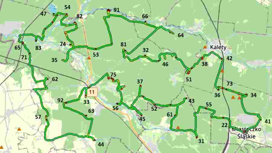 Przemykamy uliczkami niewielkiego miasteczka (Kalety) i skręcamy w krętą leśną szutrówkę. Brak licznika oznacza, że muszę na bieżąco kontrolować każdy zakręt i swoje położenie na mapie. Tym razem nie ma problemu. Paweł pewnie skręca w kierunku niewielkiego pagórka obok drogi. PK38 - Szczyt (8:57). Po kilku kilometrach i nasuwających się wątpliwościach dość szybko określamy swoje miejsce na mapie. Kiepsko przejezdna miejscami podmokła przecinka prowadzi nas prosto do skrzyżowania przecinek. Wygląd łatwego do odnalezienia punktu nie pozostawił u mnie żadnych wspomnień. PK51 - Ruina drewnianej konstrukcji (9:08). Kolejny punkt to wyłączna zasługa jadącego ze mną zawodnika. Przez dłuższy czas zupełnie nie orientuję się nawet w jakim kierunku zmierzamy. Przez gęsty młodnik przedzieramy się do położonego na przeciwnym zboczu wydmy drzewa. PK46 - Buk (9:19).