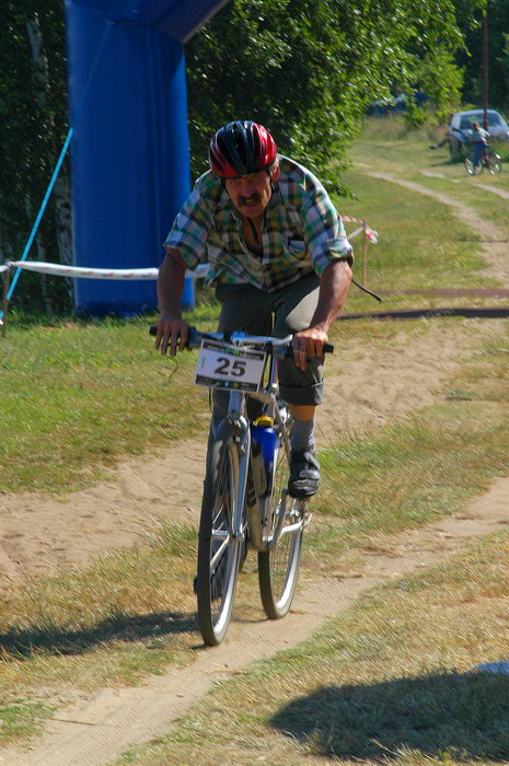 Punktualnie o godz. 12 start. Większość zawodników daje się podpuścić organizatorom pędząc co sił do pozostawionych 20 metrów z przodu rowerów. Biegną tak, jakby maraton kończył się zaraz po przejechaniu jednego okrążenia. Kiedy przesuwam się do przodu, mijając najsłabszych, w mojej przerzutce pojawia się patyk (pobocze piaszczystej drogi jest teraz niemal dziewicze, po 24 godzinach będzie tu szeroko rozjeżdżona ścieżka). Mija dłuższa chwila zanim uporam się z doprowadzeniem roweru do stanu używalności. Odnotowuję czas, pierwszej - mimo wszystko - najszybszej rundy: 53 minuty. Na każde kolejne okrążenie będę musiał rezerwować coraz więcej czasu.