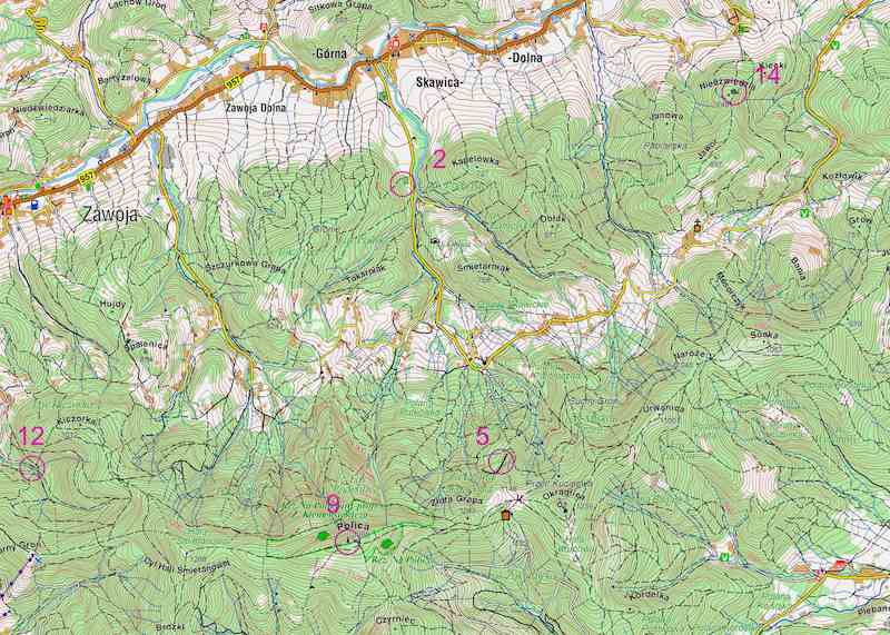 Wracam do głównej drogi przez Zawoję. Na tej części trasy asfaltów jest wyjątowo dużo. Za to zjazd w teren i nawet krótkie odcinki tam pokonywane równoważą "niedostatki" asfaltowych dróg. Podjazd boczną asfaltową drogą kończy się. Tym razem od szczytu na zboczu którego znajduje się punkt dzieli mnie niecałe 2 cm czyli poniżej kilometra. Poziomice, powiedzialbym w normie. W ruch idzie linijka, kompas. Uważne śledzenie dróżek niewiele pomaga. Wydostaję się na zbocze widocznego na mapie szczytu, jednak mam wrażenie, że nie po właściwej jego stronie. Inną drogą nadciąga spotkana wcześniej para Asia i Zyszek (?). Początkowo ruszamy przeszukać zarastające wzniesienie. Kolejna próba jest już bardziej udana. Schodzimy szlakiem po wschodniej stronie szczytu. Punkt jest tam, gdzie powien być. Na kamieniu można odczytać ślady inskrypcji pochodzącej z końca ubiegłego wieku. Tym razem przedobrzyłem. Wybierając na dole niewiele dłuższe podejście szlakiem, bezbłędnie trafiłbym na punkt. PK14 - Głaz z inskrypcją (13:38).