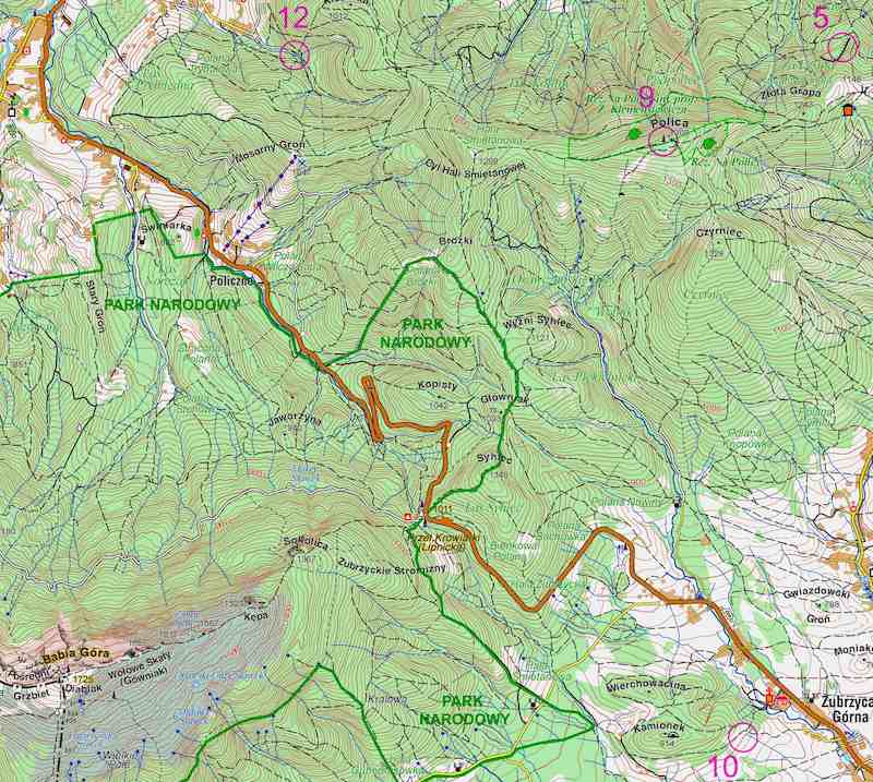 Szybki, bo asfaltowy, zjazd z przełęczy w kierunku Zubrzycy. Zaraz! Czy Park Etnograficzny to nie jest to miejsce w którym powinienem skręcić? Spoglądam krytycznie na mapę. Dokladnie tak, tuż przed ogrodzonym terenem powinna istnieć droga prowadząca w kierunku punktu. Widok drewnanego kościól potwierdza, że jestem we właściwym miejscu. Mostek. Bród. Nieco powyżej pozostawiam rower. Biorę kartę startową i mapę i ruszam na piesze poszukiwania położonego kilkaset metrów dalej punktu. Wpychanie roweru na zbocze nie ma najmniejszego sensu jeżeli mam wracać tą samą drogą. Za drugim podejściem skręcam prawidłowo w drogę wzdłuż lasu. Na kolejnej polanie widzę pokaźnej wielkości drzewo. Nie ma wątpliwości to jest to drzewo. PK10 - Drzewo na polanie (19:22).