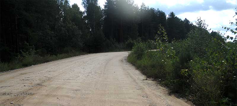 Radość z poprawy pogody trwa wyjątkowo krótko. Mijam Sejny, Giby. Powraca zachmurzenie, pojawia się nie przeszkadzająca w jeździe mżawka. Jadę przez rozległy las równą szeroką drogą prowadzącą do przejścia granicznego. Pomimo stosunkowo wczesnej pory robi się szaro, ponuro, ciemno. Deszcz wzmaga się. Rozpaczliwie rozglądam się, za jakimkolwiek schronieniem. Dopóki jestem w lesie na jakąkolwiek wiatę nie mam co liczyć. Wreszcie miejscowość Macharce, ślad skręca z głównej drogi. Mam szczęście, mimo tego, że w dalszym ciągu otacza mnie las, na leśnej polance w środku lasu pojawia się upragniona wiata.