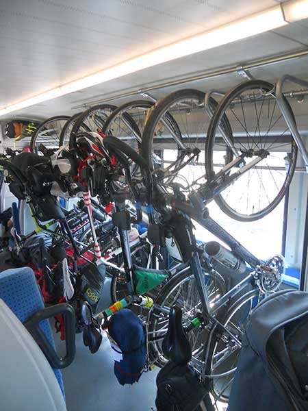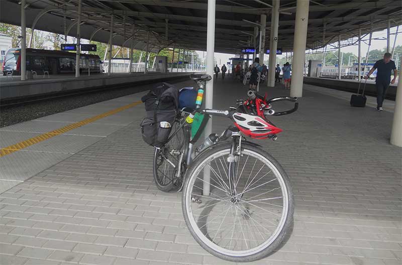 Pakuję ograniczony do niezbędnego minimum (przetestowany podczas wcześniejszych wyjazdów) ekwipunek i ruszam na stację, z której będzie odjeżdżał pociąg "nad morze". Cały mieszczący 6 rowerów wieszak jest nasz. Obok 3 zawodników jadących ze Śląska (Wiecho, Góral Nizinny, Byczys) w Łodzi dołącza obok mnie Maciek i Zuzia. Podróż upływa w beztroskiej atmosferze. Być może pokrywamy w ten sposób tkwiące gdzieś głębiej wątpliwości i obawy dotyczące czekającej nas od jutra trasy. Korzystając z okazji, dystans dzielący mnie z Gdyni do bazy w Jastrzębiej Górze pokonuję rowerem zaliczając przy okazji brakującą gminę Kosakowo.