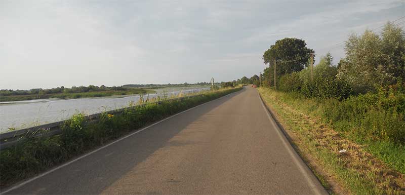 Wzdłuż asfaltowej drogi pojawia się i znika ścieżka rowerowa szlaku Green Velo. Pomimo doskonałej jakości asfaltu nie daję się skusić. Poprowadzona po istniejącej rzeźbie pagórkowatego terenu, na przemian wznosi się ponad i opada poniżej drogi generując dodatkowe przewyższenia.