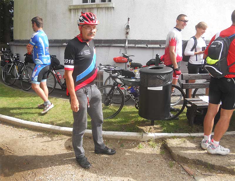 Z niecierpliwością wypatruję na horyzoncie, wypiętrzającej się znacznie ponad poziom morza i Żuław, Wysoczyzny Elbląskiej. Gdzieś w oddali pojawiają się zabudowania Elbląga. Miasto będziemy omijali z daleka ale liczę na doping elbląskich rowerzystów. Są!!! Po chwili wymija mnie znajomy "od zawsze" Darecki - legenda kultowego niegdyś maratonu na orientację Harpagan. Przez kilkanaście lat uczestniczyliśmy niemal we wszystkich jego edycjach. Kilka fotek, kilka zamienionych naprędce słów i jadę dalej.
