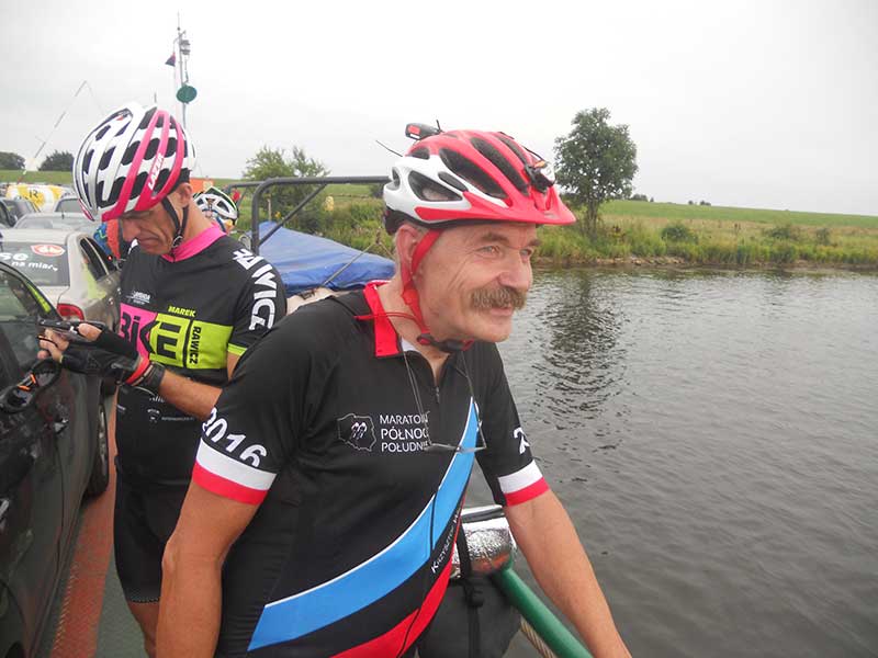 Przed nami płaskie jak stół Żuławy. W ich połowie czeka na nas przeprawa promowa. Wpadam na chwilę do znajdującego się obok drogi sklepu, by uzupełnić zapas wody (nie wiem czy dalej znajdę inny sklep) i samotnie pędzę do promu. Na prom docieram w ostatniej chwili. Nie wszyscy mają takie szczęście. Przez ponad pół godziny czekamy aż spóźnialscy kolejnym promem dołączą do biwakującej na brzegu większości. Start ostry opóźnia się o ponad pół godziny.