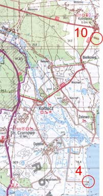 Podłoże jest twarde, pozbawione uniemożliwiającego jazdę błota, być może gdzieś pod wodą i piaskiem znajdują się betonowe płyty. Od dłuższego czasu zbliża się do nas powoli jakiś samochód. Kto mógłby pakować się w taką drogę? Może jakiś tubylec a może pracownik przepompowni, obok której umiejscowiony będzie najbliższy punkt? Kiedy jest już zupełnie blisko zatrzymuję się by przepuścić pojazd. Wychyla się uśmiechnięta twarz Daniela. Tym razem na punkcie będzie przed nami - pierwszymi zawodnikami. Dojeżdżamy na skraj jeziora i jest pewien problem. Już po pobieżnym rozejrzeniu się wygląda, że przepompownia umiejscowiona na mapie i w opisie punktu ? nie istnieje. Nie czekamy na decyzję Wigora. Po raz kolejny biorę perforator z rąk Orga i dziurkujemy kartę. PK4 Przepompownia, drzewo na SE (19:35).