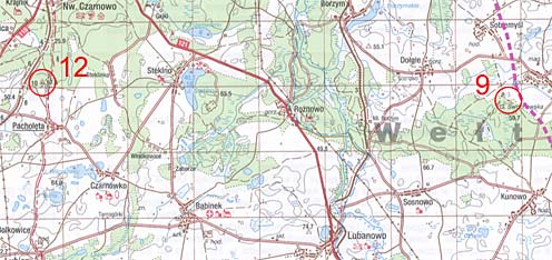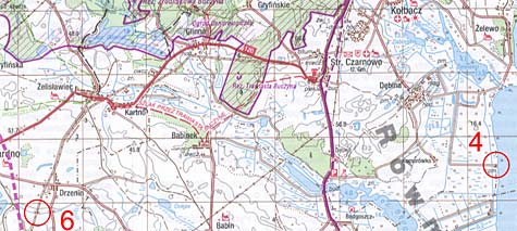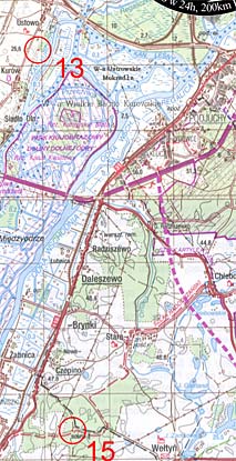 Łapczywie połykam kanapki, zjadam batony. Oglądam mapę. By dojść do siebie muszę odpocząć nieco dłuższą chwilę. Po namyśle odpuszczam najdalej na południu oddalone punkty (pojechał tam Kita). Chwila rozmowy z nadjeżdżającymi Piotrkiem oraz Tomkiem. Nasilająca się wichura wyje w stojących przy drodze drzewach. Przede mną kilkanaście mozolnie pokonywanych kilometrów w odkrytym terenie, prosto pod wiatr. Prędkość jazdy na asfalcie spada do 13-15 km/godz.. Kiedy opuszczam asfalt jest dużo gorzej. Wydaje się, że droga nie ma końca - Lubanowo, Babinek, Pacholęta.