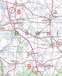 Dojazd do asfaltowej drogi i niemiłe zaskoczenie. Przed nami pojawia się wysoka siatka chroniąca przed wtargnięciem dzikiej zwierzyny. Po chwili niepewności okazuje się, że uda się ją odgiąć od dołu i w utworzonej w ten sposób szczelinie przepełznąć razem z rowerem. Główna droga, zaczyna płatać figle. W pewnej chwili zakręca (czego nie widać na nieaktualnej mapie) w kierunku północnym. Tym razem nie dajemy się nabrać, jedziemy prosto do Kobylanki. Wpadamy do lasu obok bocznej drogi. Ponieważ w opisie nie ma żadnego punktu charakterystycznego logicznym wydaje się przeczesanie lasu rosnącego obok drogi. W trakcie tej czynności podjeżdża samochód, z którego wyskakuje jakiś gość. No tak, któż by inny - organizator Daniel Śmieja - który nie zdążył jeszcze rozstawić punktu. Próbuje dowiedzieć się od nas jak daleko odjechaliśmy od głównej drogi i w którym miejscu powinien umieścić oznaczenia PK i perforator. Nie czekając na decyzję perforujemy kartę startową i pozostawiamy samego z tym problemem. PK10 Nasyp, drzewo na N (18:48)