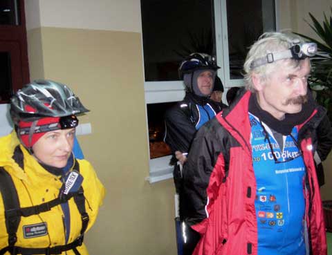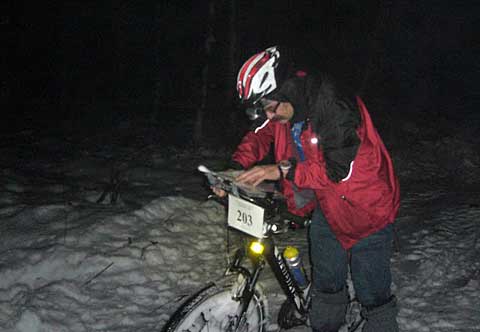 Wycofujemy się i skręcamy w boczną leśną drogę. Stan drogi ponownie uniemożliwia mi jazdę, radzący sobie w takich warunkach Trolle znikają w ciemnościach nocy. Przede mną koszmarne 2 km pchania roweru. Wreszcie zdająca się nie mieć końca droga kończy się, wypluty z sił wracam do cywilizacji. Mijam niewielką wioskę i ponownie jadę poznaną wcześniej asfaltową drogą. Będę musiał opuścić obszar zaznaczony na mapie ale po dotychczasowych doświadczeniach nawet przez moment nie zastanawiam się nad alternatywą - wyborem najkrótszej drogi przez pola. Zgodnie z oczekiwaniami skręcając w najbliższą drogę "wracam na mapę". Wszystko się zgadza. Tylko gdzie są ślady moich poprzedników? Powinni jechać tą drogą co najmniej kilkanaście minut temu. Odnajduję przecinkę prowadzącą prosto do punktu. Ponieważ pokrywa ją kilkunastocentymetrowa warstwa dziewiczego śniegu wracam do zauważonej chwilę wcześniej drogi - ubitej drogi, którą nawet ja mogę jechać bez problemu.