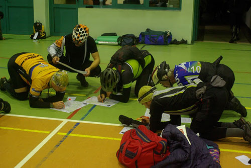 Start coraz bardziej opóźnia się. Wreszcie dociera organizator z mapami. Na początek "wypycha" na trasę piechurów. Teraz czas na rowerzystów. Razem z Tomalosem rozplanowujemy całą trasę (zupełnie bez potrzeby na zaliczenie wszystkich punktów i tak nie mam szans). Na początek punkt oznaczony nr 3 dający 50 punktów wagowych w skali 30-60. 50-tka oznacza, że punkt może należeć do tych nieco trudniejszych. Opuszczam szkołę i w drodze do Glisna "zawisam" pomiędzy Tomalosem i Wojtkiem Paszkowskim bezskutecznie próbując na asfalcie dogonić tego pierwszego. Kiedy skręcamy w las, ten znika bezpowrotnie. Na jednym z ostatnich przed punktem leśnych skrzyżowań spotykam Danusię Blank i Łukasza Wronę. Razem będziemy "zdobywać" kilka kolejnych punktów.
