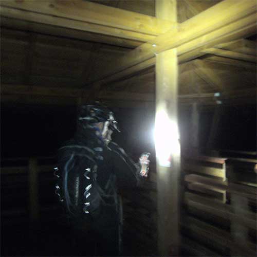 Bezproblemowy przejazd w kierunku punktu? Moje obawy wzbudza moment, w którym będziemy musieli opuścić asfalt. Widok przerywanej linii prowadzącej przez pola do lasu nie napawa optymizmem. Szału, jak to na nierównych polnych drogach, nie ma. Jakieś koleiny, jakieś kałuże. Przy odrobinie uwagi da się nawet dość szybko jechać. Odcinek leśnej drogi. Jacek czujnie zauważa turystycznąścieżkę poprowadzoną w kierunku wieży. Zdobywanie szczytu po stromo wznoszącym się, porośniętym krzakami zboczu od innej strony nie byłoby łatwe i przyjemne. Rowery pozostawiamy w połowie podejścia. Aby zaliczyć punkt kontrolny musimy jeszcze "wdrapać" się na najwyższą platformę wieży. W dzień rozpościera się stąd rozległy widok, teraz można tylko spojrzeć naświatła pobliskich wsi i odległych miasteczek. PK13 - 1:23 (55) (wieża na szczycie).