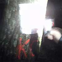 Jacek z Wojtkiem próbują rozwiązać łamigłówkę. Wreszcie osiągamy skraj lasu. Jedziemy przez las. Bezskutecznie przeszukujemy wzgórze obok skrzyżowania dróg. Kolejne skrzyżowanie, na którym przed chwilą widać byłoświatełka jest już tym właściwym. Pozostałości cmentarza. W najdalej oddalonym od drogi jego miejscu odnajdujemy właściwe drzewo. PK12 - 23:31 (56) (stary cmentarz, przy pomnikach we wschodniej części).