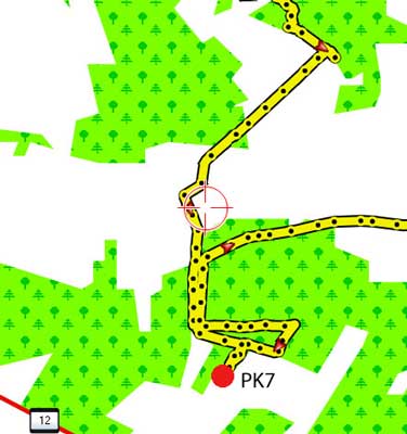 Samotnie już zmierzam do przez las. Chwila rozterki na rozwidleniu dróg. Losowo wybieram jedną z nich. Po chwili kierując się wskazaniami liczniki porzucam rower i ruszam na poszukiwania "dołu". Takiego dołu trudno nie zauważyć, to zarastająca lasem pozostałość po niewielkiej żwirowni. Z góry wypatruję mijesca które pasowałoby do opisu "dwa drzewa". Spisuję dwuliterowy kod (PK12) - wielkie czerwone litery namalowane na jednym z drzew.