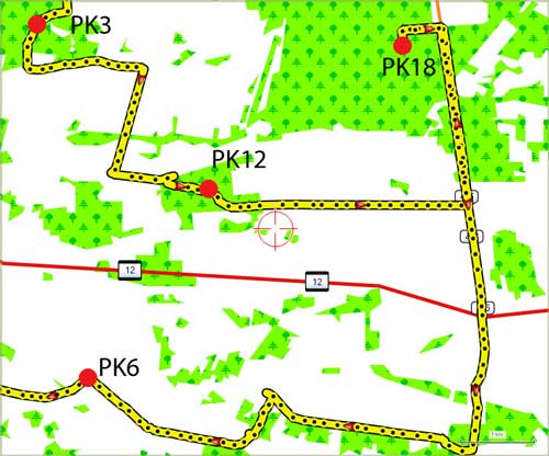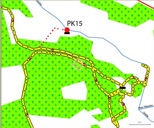 Opuszczam nieprzyjazne łąki, by asfaltową drogą dotrzeć w okolice PK15. Na początku lasu odmierzam odległość jaka dzieli mnie od kolejnej leśnej drogi. Skręcam w prawo w odpowiednią drogę i po kilkuset metrach ponownie w prawo na wschód. Dojeżdżam do zaznaczonych na mapie zabudowań. Gospodarz wskazuje mi kierunek w którym pojechało dwóch zawodników, którzy byli tu przede mną. Jadę wzdłuż rzeki w jedną stronę, próbuję przedzierać się przez pokrzywy w drugą stronę. Sprawdzam kierunek uregulowanej w tym miejscu rzeki. W żaden sposób istniejącej rzeczywistości nie mogę dopasować mapy. No ale przecież skręciłem w odpowiednią drogę dojechałem do odpowiednich zabudowań. Zmęczony ale przekonany, że gdzieś w pobliżu jest punkt, którego nie mogę odnaleźć rezygnuję z poszukiwań. Ruszam z nadzieją, że kolejne punkty będą łatwiejsze.