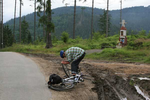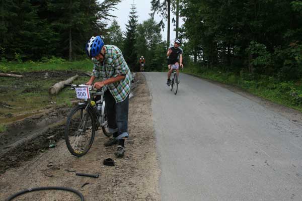 Węgierska Górka, Milówka i rozpoczyna się kolejny stromy podjazd. Przez Kamesznicę wjedziemy na przełęcz Koniakowską i Ochodzitą. W nogach już 210 km a nachylenie rośnie nawet do 26 stopni. Nawet wpychanie roweru wymaga pewnego wysiłku. Gdzieś po drodze eksploduje mieszanka tego co spożyłem podczas pobytu na ostatnim bufecie. Nie ma nawet czasu by szukać jakichkolwiek krzaków.