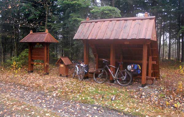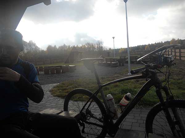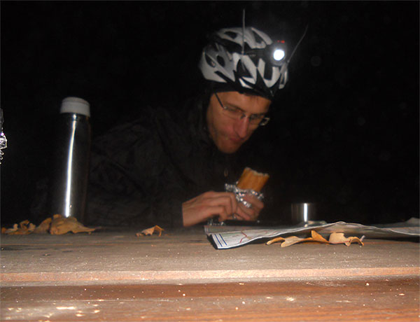 Pod znajdującą się tu wiatą zatrzymamy się aż do nadchodzącego świtu. Po tym gdy bez ostrzeżenia przestaje świecić czołówka Piotrka, nie mamy wystarczającego oświetlenia do dalszej jazdy. Biorę się za kolejną porcję makaronu. Dbamy o to, by Piotr nie musiał jeść zabranej jako prowiant kiełbasy na zimno. Niezbyt intensywne i krótkie opady odeszły w zapomnienie. Wreszcie pomimo zachmurzenia robi się na tyle widno, że możemy jechać dalej. Przez 10 nocnych godzin pokonaliśmy zaledwie 100 km (a przez ostatnie 6 godzin zaledwie połowę tego dystansu). rednia prędkość jazdy osiągnęła oszałamiającą wartość 13:34 km/godz.
