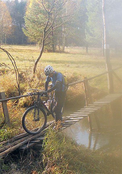 Opuszczamy wyludnioną o tej porze roku miejscowość wypoczynkową. Przed nami długi odcinek porośniętej trawą leśnej drogi wzdłuż poznanej wcześniej rzeki Czarnej. Kryzys odchodzi w niepamięć, przekraczam jakąś niewidoczną granicę. Znużenie monotonną jazdą (nie zmęczenie - na to jeszcze za wcześnie) bezpowrotnie mija. Wirtualna - bo istniejąca jedynie w mojej głowie - muzyka grupy Arkona nakręca mnie do jazdy. Zaczynam jechać jak w transie. Teraz mógłbym spędzić na rowerze nawet całą kolejną noc. Na równych asfaltowych drogach wychodzę na prowadzenie. Porywisty przeciwny wiatr i niewielkie podjazdy nie stanowią dla mnie żadnej przeszkody.