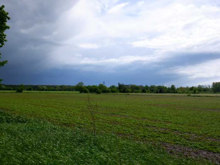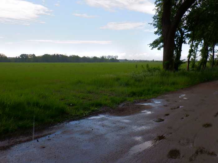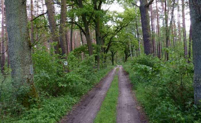 Na horyzoncie pokazują się białe obłoczki i cienkie pasmo niebieskiego nieba. Niezależnie jak bardzo przemoknę, wkrótce będę się suszył i wygrzewał w promieniach słońca. Jadąc "pod prąd" szybciej przebiję się przez falę opadów. Czy ta piaszczysta droga przez las byłaby łatwiejsza do pokonania przed deszczem? Po zaledwie 20 minutach nieoczekiwanie przestaje padać. W zagłębieniach gruntowej drogi zgromadziła się woda ale już zaczyna świecić słońce. Głośne grzmoty wskazują, ze centrum burzy ominęło mnie bokiem. ślady bardziej intensywnych opadów spotkam na najbliższych i dalszych drogach i ścieżkach.