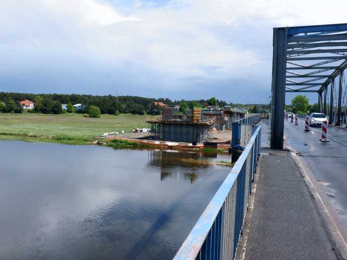 Sprawnie udaje mi się przeskoczyć mijankę na głównej drodze przez most. Rzeka, którą pokonuję wygląda na Wartę. Tuż obok powstają przęsła nowego mostu. Na mojej drodze wzdłuż rzeki pojawia się płot. Nie jest źle. Tubylcy już udrożnili tę przeszkody. Jak by co, to znak na ogrodzeniu - zakaz przejścia - nic nie wspomina o przejeździe rowerem.